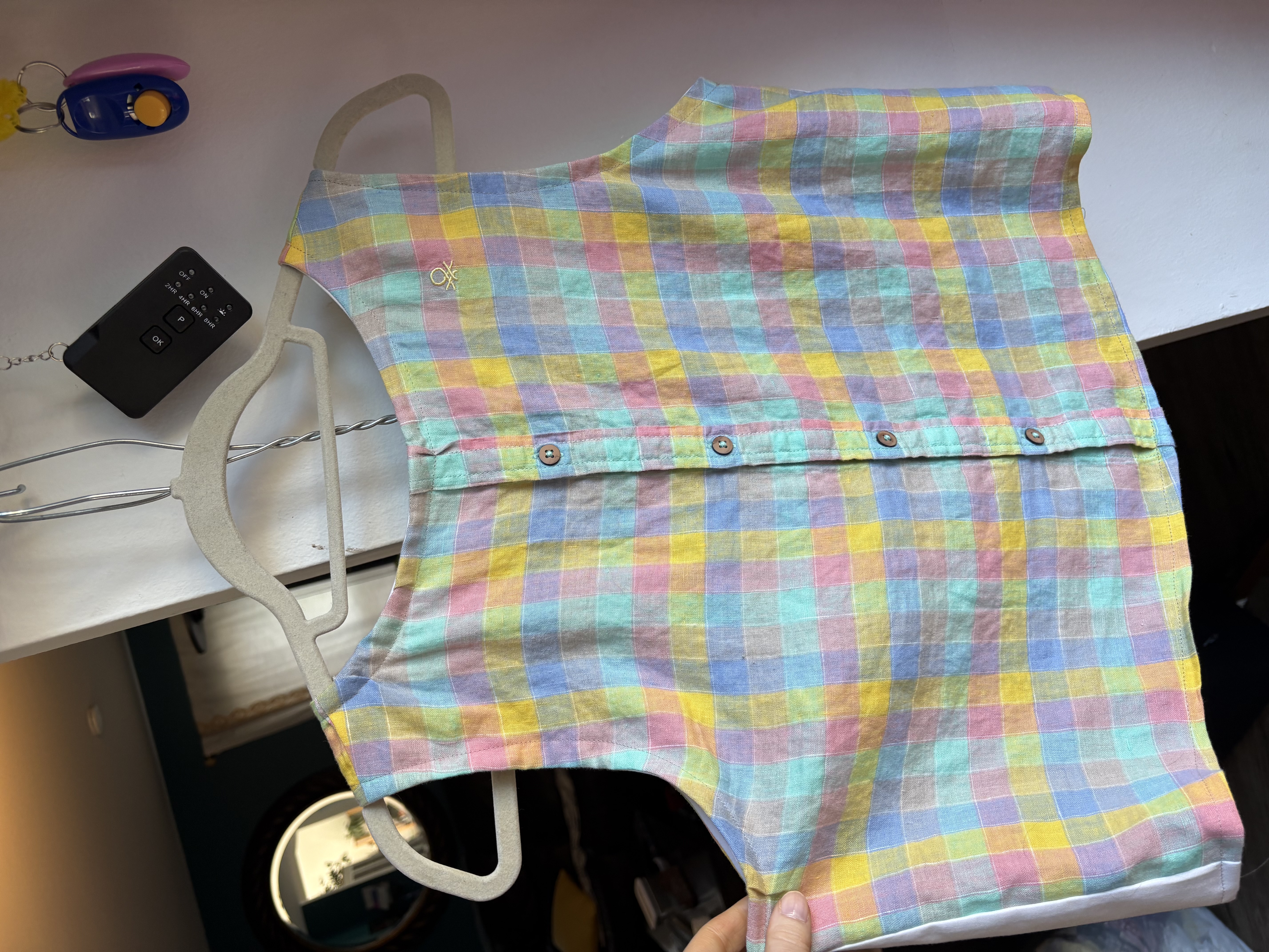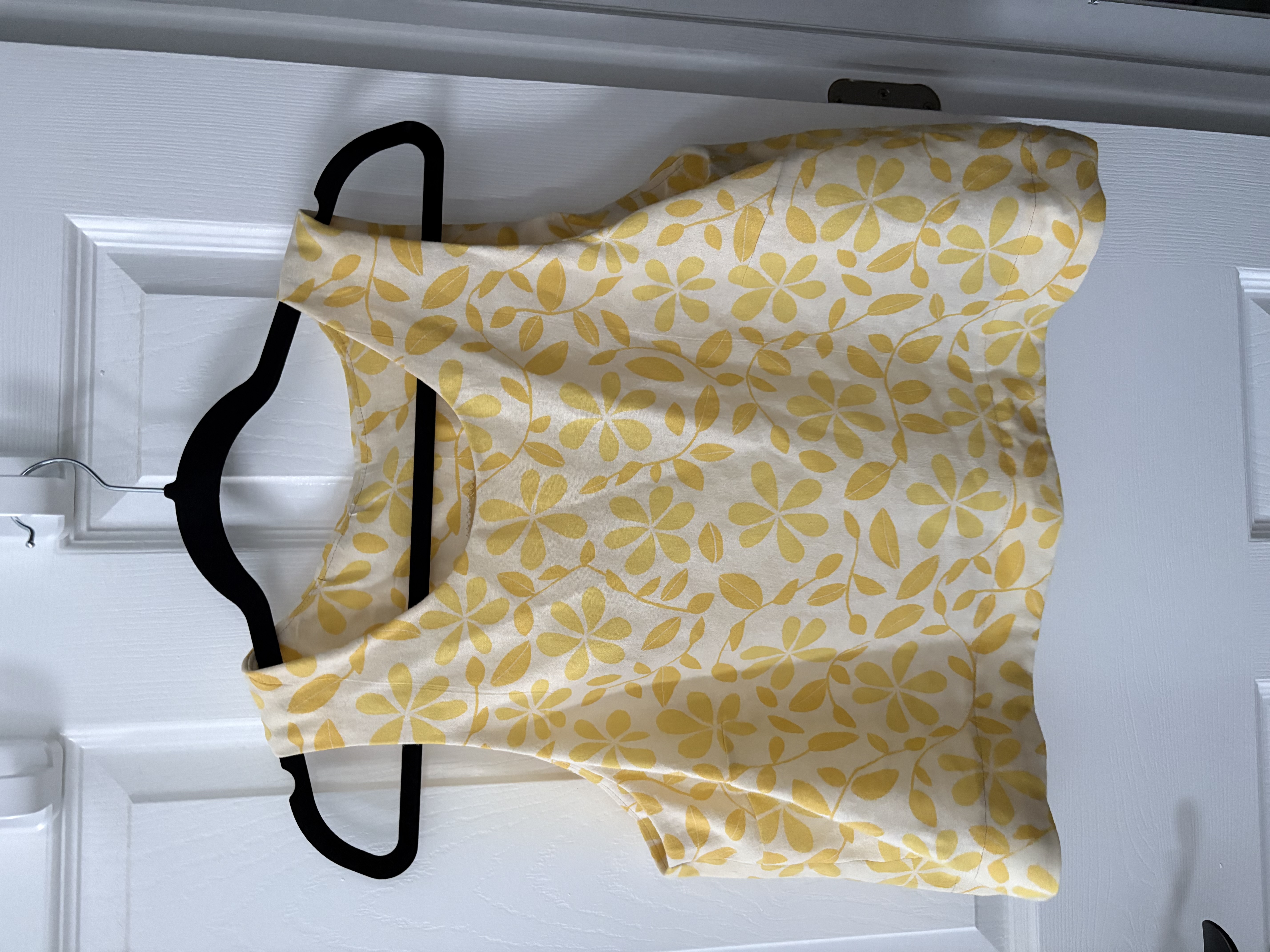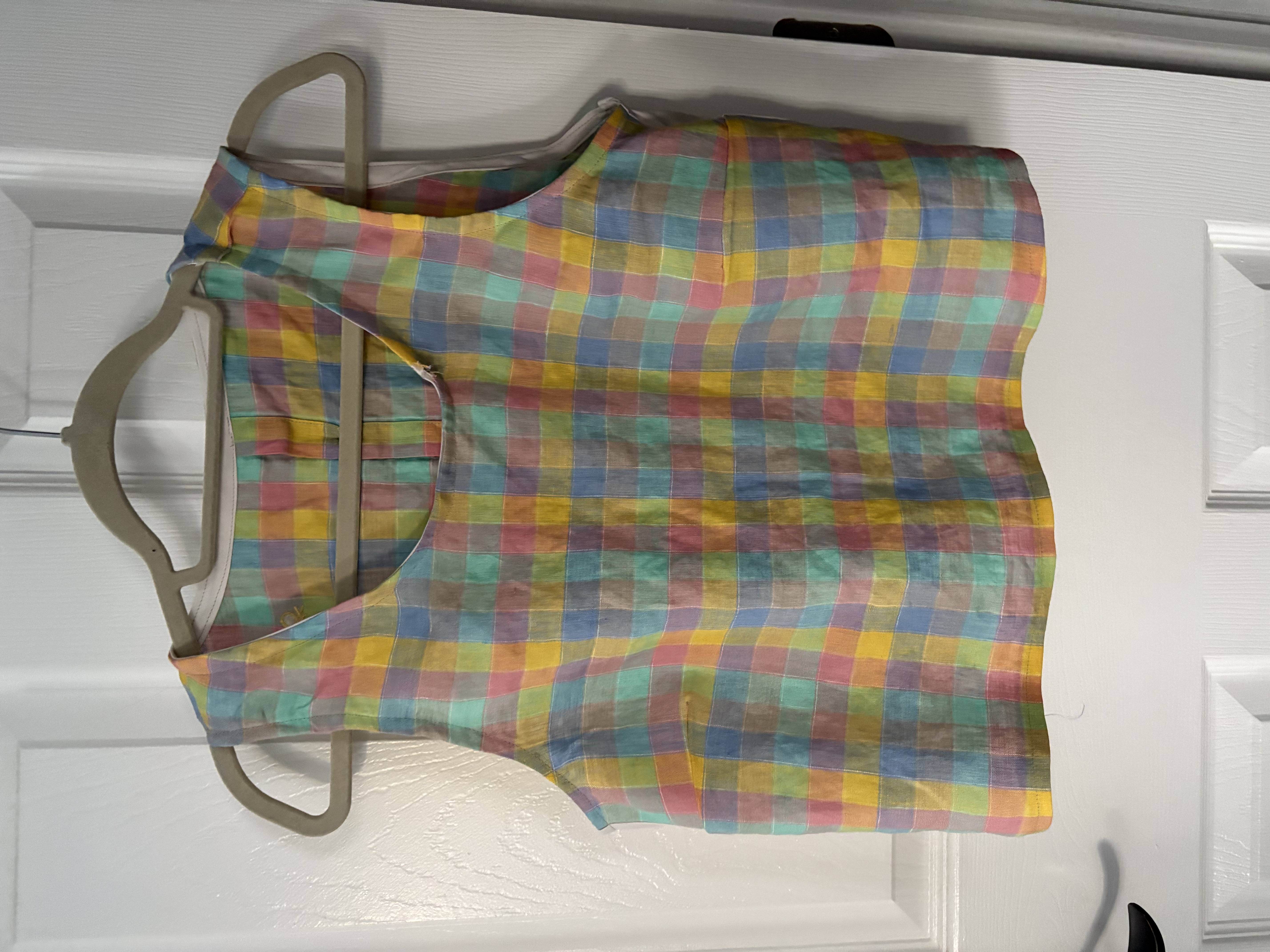 This is the Ashton Top from Helen’s Closet. It was so easy and fun! I made the cropped view. The yellow/white used the facing, and the pastel plaid used the bias binding. It was made from a thrift shop men’s shirt.
